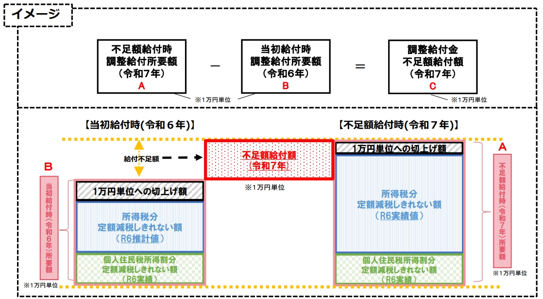 令和6年に定額減税と、減税しきれなかった人へ調整給付(当初調整給付)が行われました。令和6年分所得税及び減税額が確定したことに伴い、十分に減税を受けられていない人などについては、調整給付の不足額を再計算し給付します。