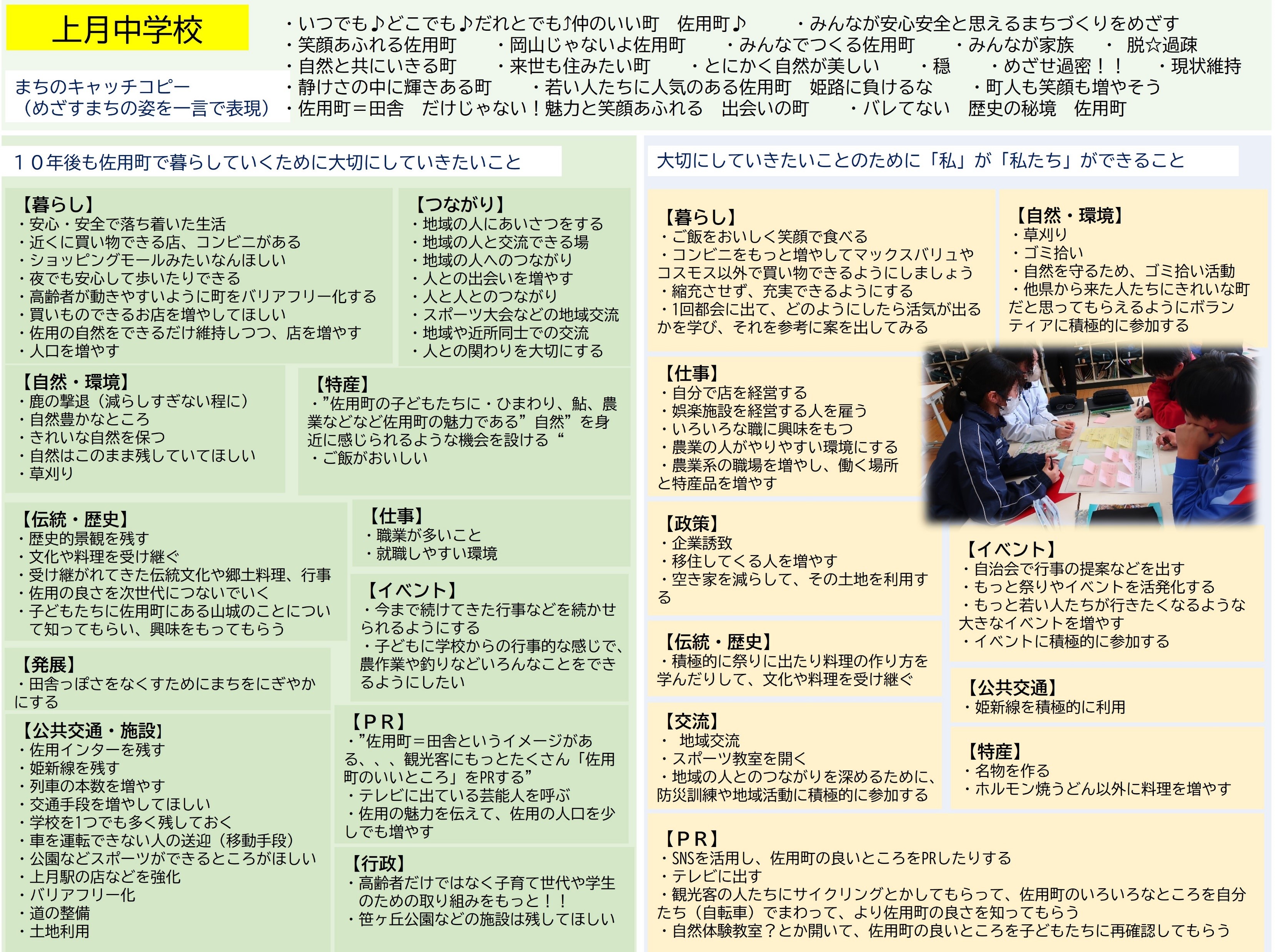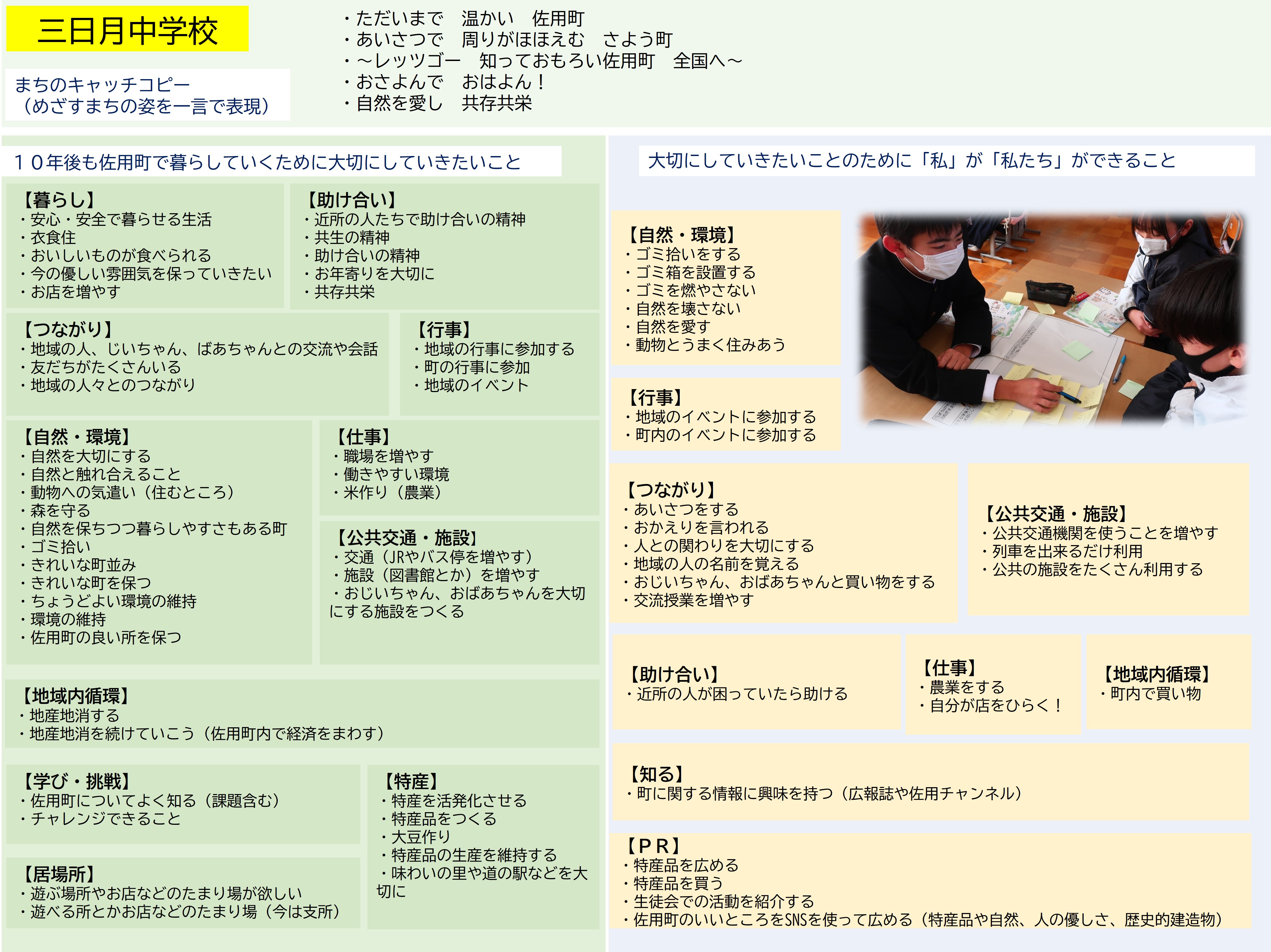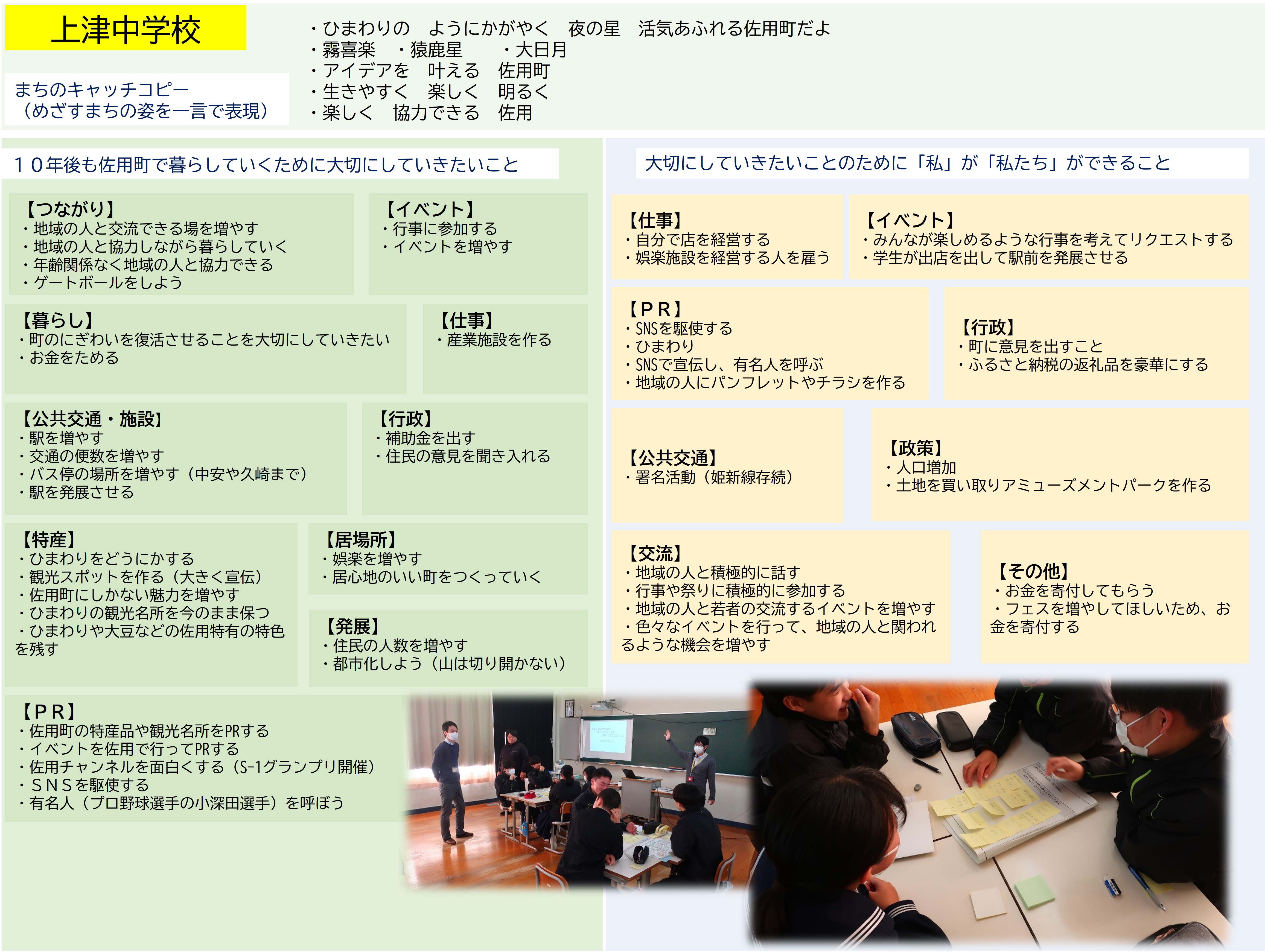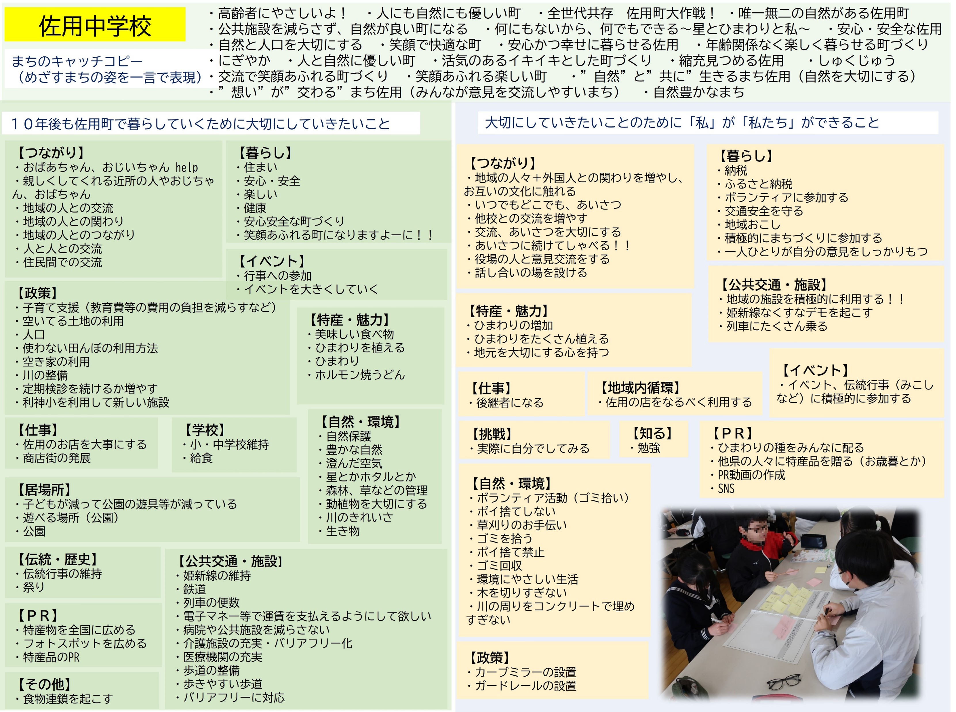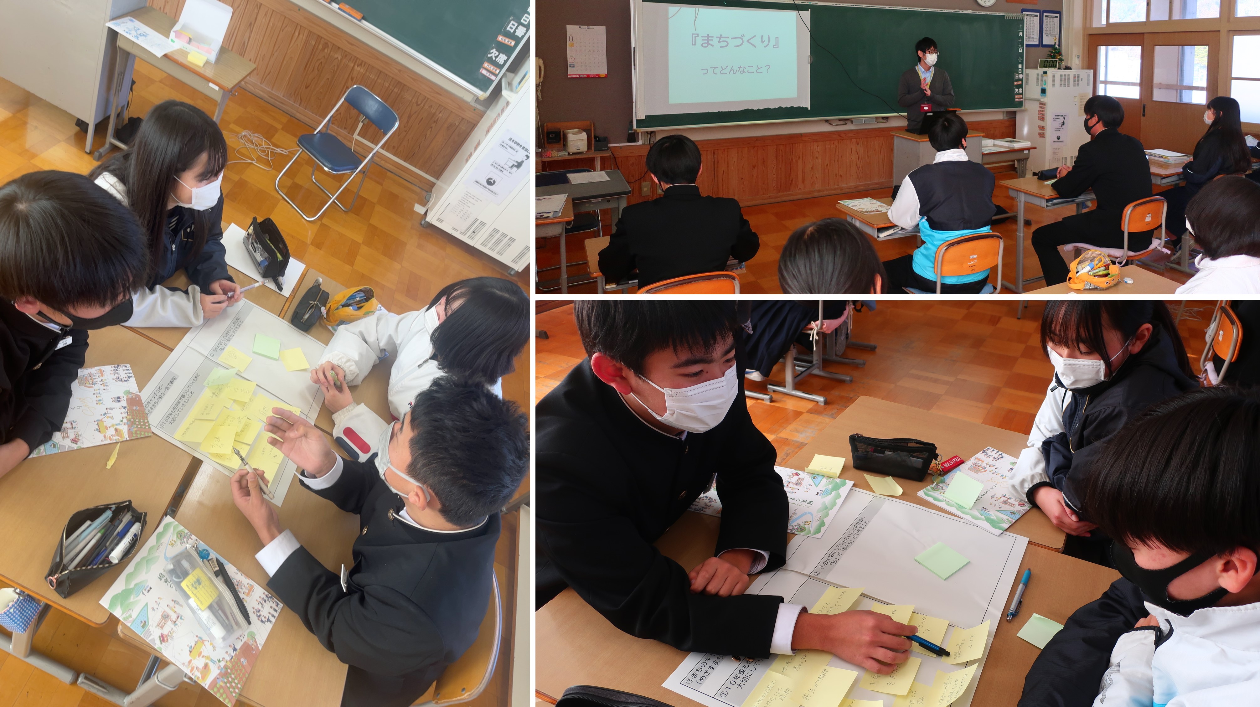 佐用町では、次期総合計画に子どもたちの意見や考えををたくさん取り入れていきたいという思いから、中学生を対象に佐用町のまちづくりの出前授業を実施し、子どもたちと一緒にまちの未来について話し合っています。
