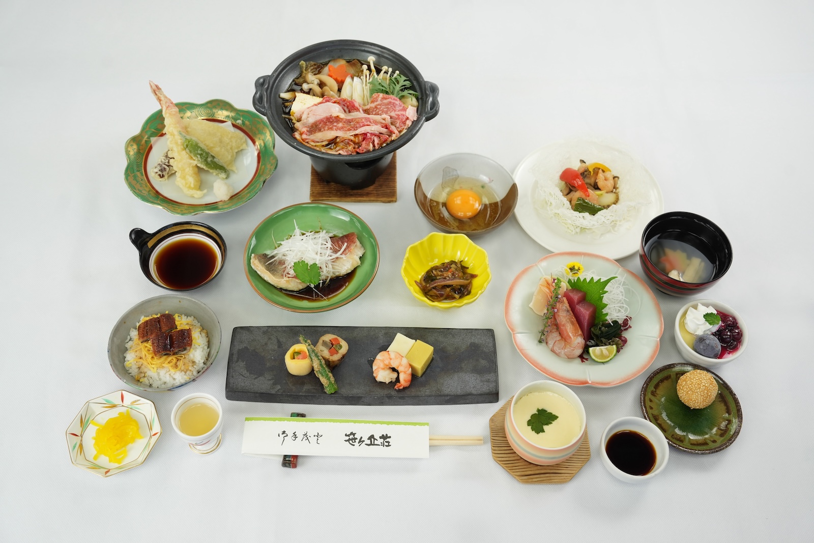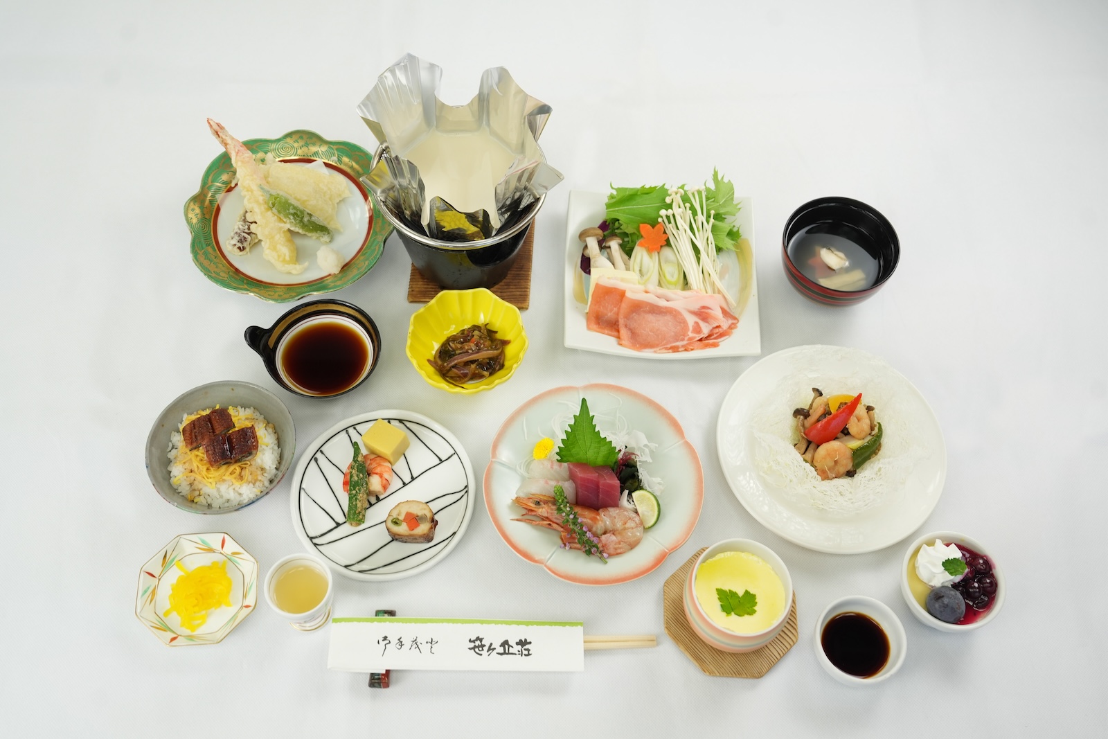 季節感あふれる前菜、出汁の旨味が凝縮された茶碗蒸し、新鮮なお刺身、とろけるようなすき焼き、旬の野菜や魚介を衣で包んで揚げたサクサクの天ぷら、彩り豊かな海鮮炒め物、その他にも、小鉢、旬の一品、お吸物、ご飯物、デザート2種が付き、ボリューム満点です。