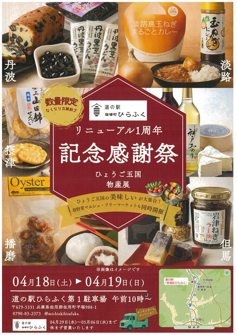 令和7年4月20日にリニューアルオープンした「道の駅宿場町ひらふく」。そこで、1周年を迎えるにあたり『記念感謝祭』を開催します。当日は、日ごろの感謝の気持ちを込めて、ひょうご五国の”美味しい”が大集合するほか、キッチンカーなども出店します。