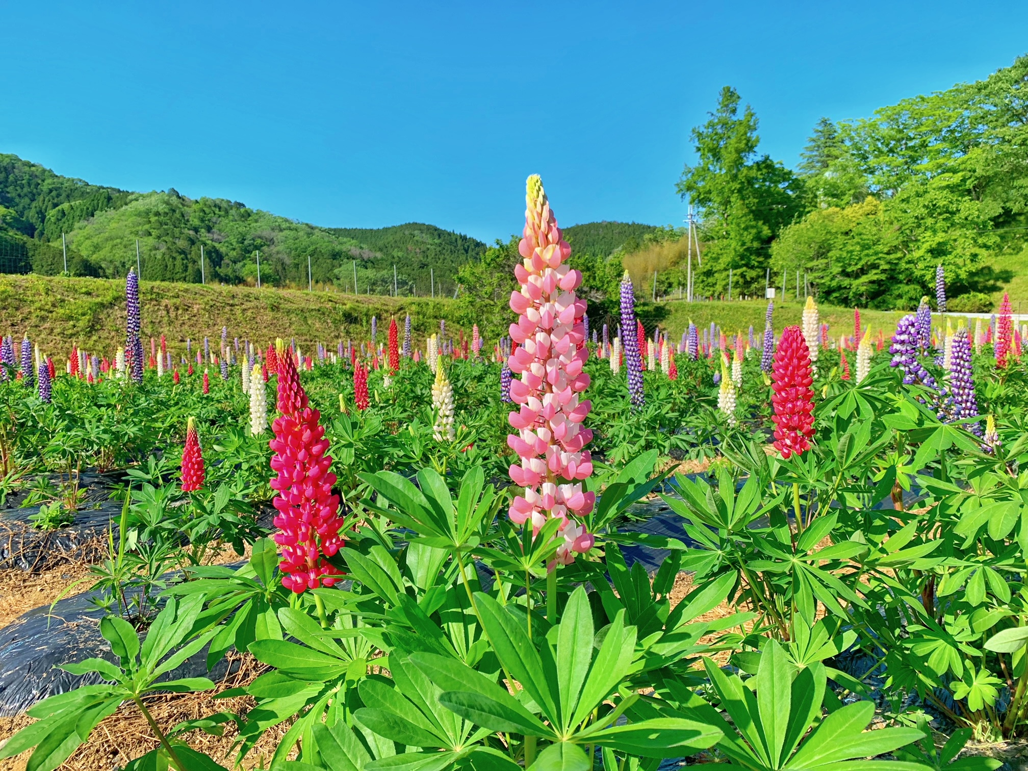 約40aの畑に植栽された色とりどりのルピナス約8,000本が5月中旬ごろに楽しめます。