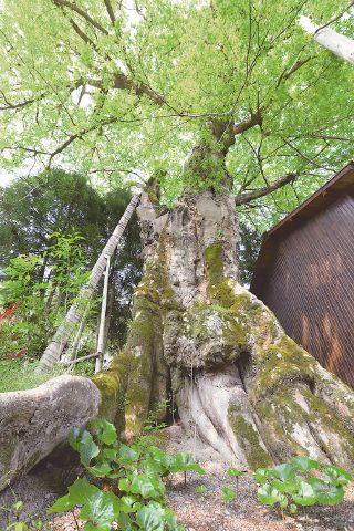 樹齢約800年以上の「三日月の大ムク」。目通りの幹回り9.9メートル、樹高18.5メートルで、昭和46年に天然記念物として県指定文化財になりました。ムクの木としては日本一と称賛され、全国から多くの人が訪れます。