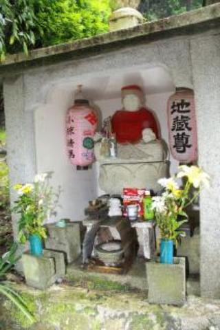 桑野集落から上三河集落を結ぶ峠が「寺坂峠」です。坂を上りきったところにお地蔵さんがまつられ、その横には休憩小屋が建てられています。