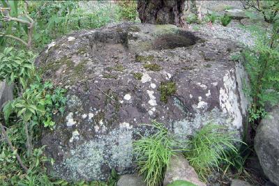 静かな境内の一角に手水鉢(ちょうずばち)として加工・使用されたと思われる大きな石が一つあり、大きさは長辺155センチ、短辺110センチで、高さは70センチあります。この石の上面はやや平らになっており、直径32センチ・深さ18センチの丸穴が掘られていることから、本来は塔の基礎としての役割を持つ礎石(心礎(しんそ))であったことが分かります。