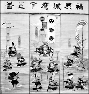 なお、福原城主は秀吉に討ち取られたと伝えられていますが、高尾山福円寺にて家臣と共に自刃したとも伝えられています。またその後の逸話として、落城の際に城主四男の藤松丸(上記絵図左下)は、家臣によって美作国角南村の郷士にかくまわれ、成人した後に佐用村へ帰郷したことなど、福原城にまつわる話が佐用町史には載せられています。上記の絵図は子孫が江戸時代に描かせた合戦前の福原家主従らの様子を表しており、同氏の数少ない貴重な資料として、平成5年に町指定文化財となりました。
