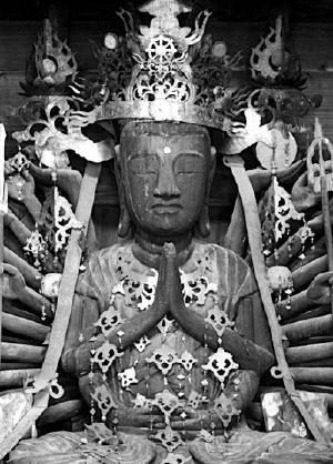 像は、けやきの寄木造で高さ175.5センチ、頭上面は21面と例のない構成を持つ珍しいものです。製作は室町時代ころと考えられています。