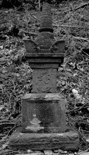 塔本体は安山岩製で、高さは120センチありますが、頂部の一部を欠いています。そして基礎部分正面に彫られる格狭間は、主に丹波・丹後地方でみられる特徴的な形をしており、また「道珍」「康正二・・」(一四五六年)の刻銘から願主・造立年が分かる貴重なものといえます。