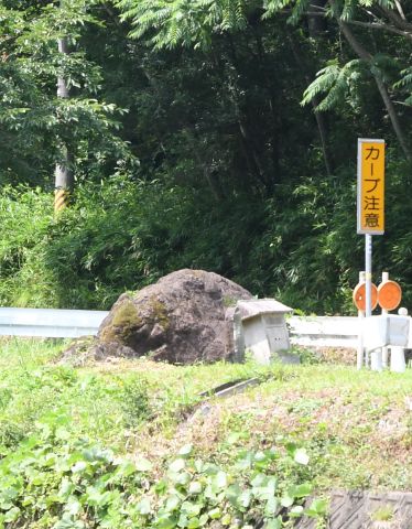 本位田乙集落と福澤集落の境の川沿いに、県道にせり出すようにして大きな岩があります。全長約3メートル、高さ約1メートルほどの岩は、小さな祠とともにガードレールで囲まれており、地元では「こっといわ」と呼ばれています。
