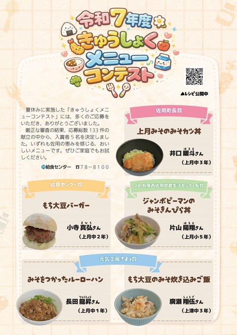 令和7年度きゅうしょくメニューコンテスト 令和7年度のきゅうしょくレシピコンテストに応募のあった133人から選ばれた優秀な作品のレシピを公開します。ぜひ、自宅で作ってみてください。 佐用町長賞 井口 暖斗さん(上月中3年) 「上月みそのみそカツ丼」 ☞レシピはこちら 給食センター賞 小寺 真弘さん(上月中2年) 「もち大豆バーガー」 ☞レシピはこちら JA兵庫西佐用営農生活センター長賞 片山 陽翔さん(上月小5年) 「ジャンボピーマンのみそきんぴら丼」 ☞レシピはこちら 元気工房さよう賞 長田 龍昇さん(上月中1年) 「みそをつかったルーローハン」 ☞レシピはこちら 元気工房さよう賞 廣瀬 翔伍さん(上津中3年) 「もち大豆のみそ炊き込みご飯」 ☞レシピはこちら カテゴリー 町民の方へ 教育・文化 教育| 情報発信元 佐用町学校給食センター お問い合わせ 電話番号:0790-78-8100 メールアドレス:s-kyusyoku@town.sayo.lg.jp この課・施設の詳しい情報を見る アンケート より良いウェブサイトにするため、ぜひご協力ください。 Q.このページの情報は、あなたのお役に立ちましたか? 役に立った どちらともいえない 役に立たなかった 投票しないで結果を見る