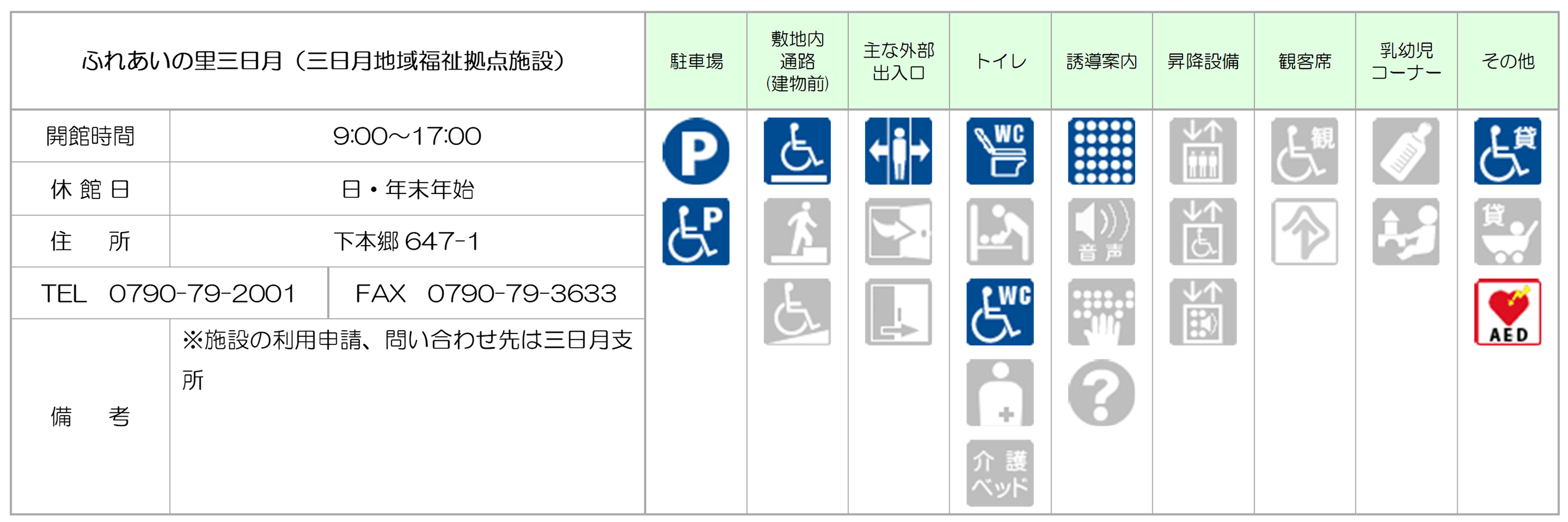 ふれあいの里三日月 住所:679-5132 兵庫県佐用郡佐用町下本郷647番地1 電話番号:0790-79-2001 ファックス番号:0790-79-3633 お問い合わせ ふれあいの里三日月は三日月地域福祉拠点施設の一部です。令和8年4月から、施設の利用申請窓口が三日月支所へ変更になります。 ●バリアフリー情報 地図 ふれあいの里三日月(三日月地域福祉拠点施設) カテゴリー 町民の方へ 健康・医療・福祉 福祉と介護| アンケート より良いウェブサイトにするため、ぜひご協力ください。 Q.このページの情報は、あなたのお役に立ちましたか? 役に立った どちらともいえない 役に立たなかった 投票しないで結果を見る