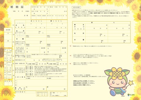 町では、人生の大きな節目である結婚を大切な思い出にしてもらおうと、オリジナル婚姻届を作成しました。婚姻届は、町観光イメージキャラクターのおさよんと町花のひまわり、町内の名所をあしらったデザインになっています。ぜひ、ご利用ください。